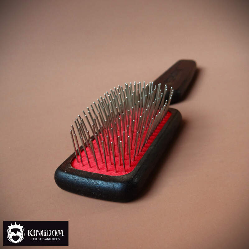 De lange, roestvrijstalen pinnen met afgeronde punten glijden soepel door de vacht en verwijderen klitten en losse haren zonder te trekken of de huid te irriteren.