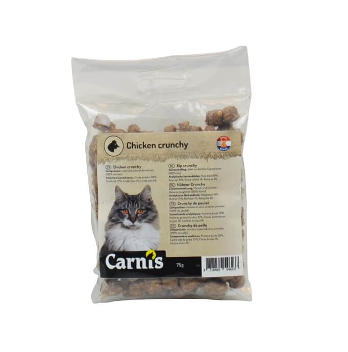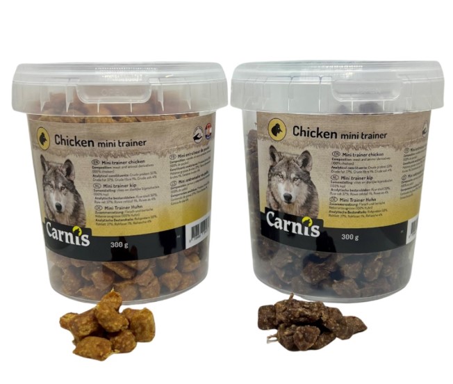 Carnis Kip crunchy en Carnis Kip mini trainers, onweerstaanbaar lekker. Een smakelijk tussendoortje voor je kat of hond met een krokante bite.