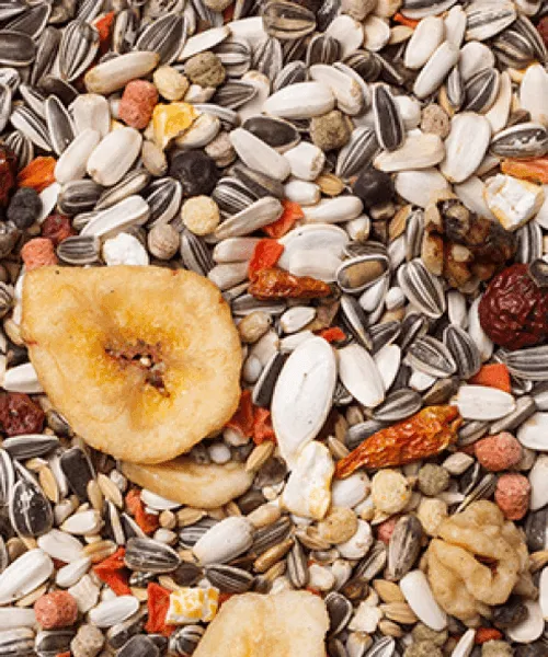 Zonnepitten gestreept, zonnepitten wit, cardy, sorgho wit, tarwe, paddyrijst, boekweit, kempzaad, geëxtrudeerde pellets, vitsen, haver gepeld, millet geel, grit, millet wit, wortelstukjes, bananenschijfjes, pompoenzaad, witzaad, lijsterbessen, mariëndistel, jeneverbessen, Japanse millet, appelstukjes, rozenbottelvrucht, walnoten, rozijnen, gepofte maïs, gepelde pinda’s, chilipepers