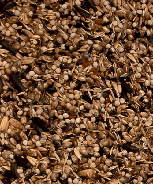 Wilde zaden, raapzaad, witzaad, perilla wit, nigerzaad, lijnzaad, boekweit, haver gepeld, kempzaad, mariëndistel, perilla bruin, zonnepitten zwart, sesamzaad, cardy, cichoreizaad, spinaziezaad, lijsterbessen, dennenzaad fijn, cypressenzaad