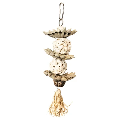 De Back Zoo Nature Palm Star Balls is een natuurlijk vogelspeeltje uit de Pure-lijn, samengesteld uit materialen zoals zeegras, sola hout en mahonieschijfjes. Het speeltje is ontworpen om foerageren en slopen te stimuleren door ruimte te bieden voor het verstoppen van snacks of voeding. De verschillende texturen nodigen uit tot ontdekken en knabbelen, terwijl de quicklink het eenvoudig maakt om het speeltje op te hangen in de vogelkooi. Omdat het om natuurlijke materialen gaat, is elk speeltje uniek in vorm en uitstraling.