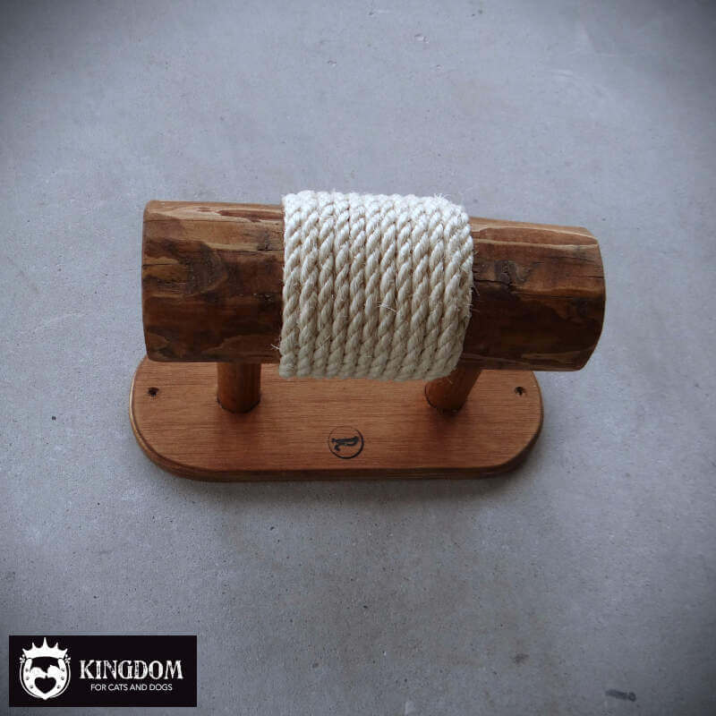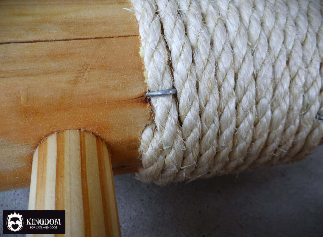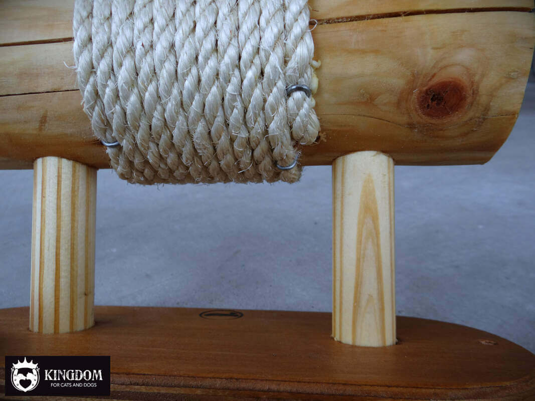 Om het sisal touw goed op zijn plek te houden is de eerste en laatste rij verzonken in het hout gelegd. Door de groef waar het sisal touw in ligt kan het niet verschuiven op het moment dat je kat er met zijn gewicht aan hangt. Het begin en eind punt van het touw zijn volledig in de stam weg gewerkt.