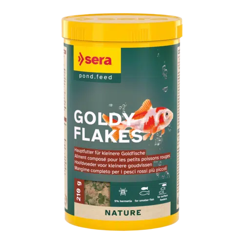 Goudvissen moeten een gevarieerde en aan hun soort aangepaste voeding krijgen. Fysiologisch hebben de dieren een speciale eigenschap: ze hebben geen maag, maar een maagachtig deel van de darm en hebben geen vol gevoel. Deze alleseters zijn daarom voortdurend op zoek naar voedsel. Om overvoederen te voorkomen, is het raadzaam goudvissen meerdere keren per dag kleinere porties licht verteerbaar voeder met goed benutbare proteïnen en koolhydraten te geven. De hoogwaardige goudvisvoeders van sera voldoen aan de voedingsbehoeften van deze koudwatervissen. Goldy Flakes en Goldy Granules zijn twee hoogwaardige hoofdvoeders, die kleine en grote vissen en de bijzonder veeleisende kweekvormen alle belangrijke voedingsstoffen geven die ze nodig hebben. Het kleurvoeder Goldy Color is geschikt om de kleurontwikkeling te bevorderen. Alle goudvisvoeders van sera behoren tot de “Nature”-serie en bevatten geen kleur- en conserveermiddelen.