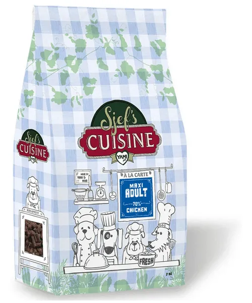 Sjef’s Cuisine Maxi Adult is speciaal ontwikkeld voor de grotere familiehond. Het formaat brok is aangepast aan grotere honden, stimuleert het kauwen en helpt tandplaque voorkomen. De uitgebalanceerde ingrediënten-formule zorgt voor een optimale spijsvertering. Door kip als eiwitbron in te zetten heeft de Adult Maxi een zeer hoge acceptatie.
