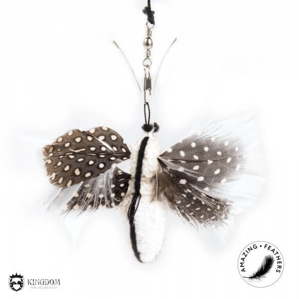1x Buzz-mot prooi-hanger met wit/zwart chenille lijfje en veren vleugels van ca. 7 x 8 cm