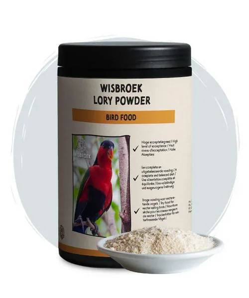 Wisbroek Lory Powder mag droog gevoerd worden. Dit vermindert de kans op schimmel aanzienlijk. Lory Powder bevat alle voedingsstoffen die de nectaretende vogels nodig hebben. Het poeder is vergelijkbaar met stuifmeel, waardoor het door de vogels sneller geaccepteerd wordt.